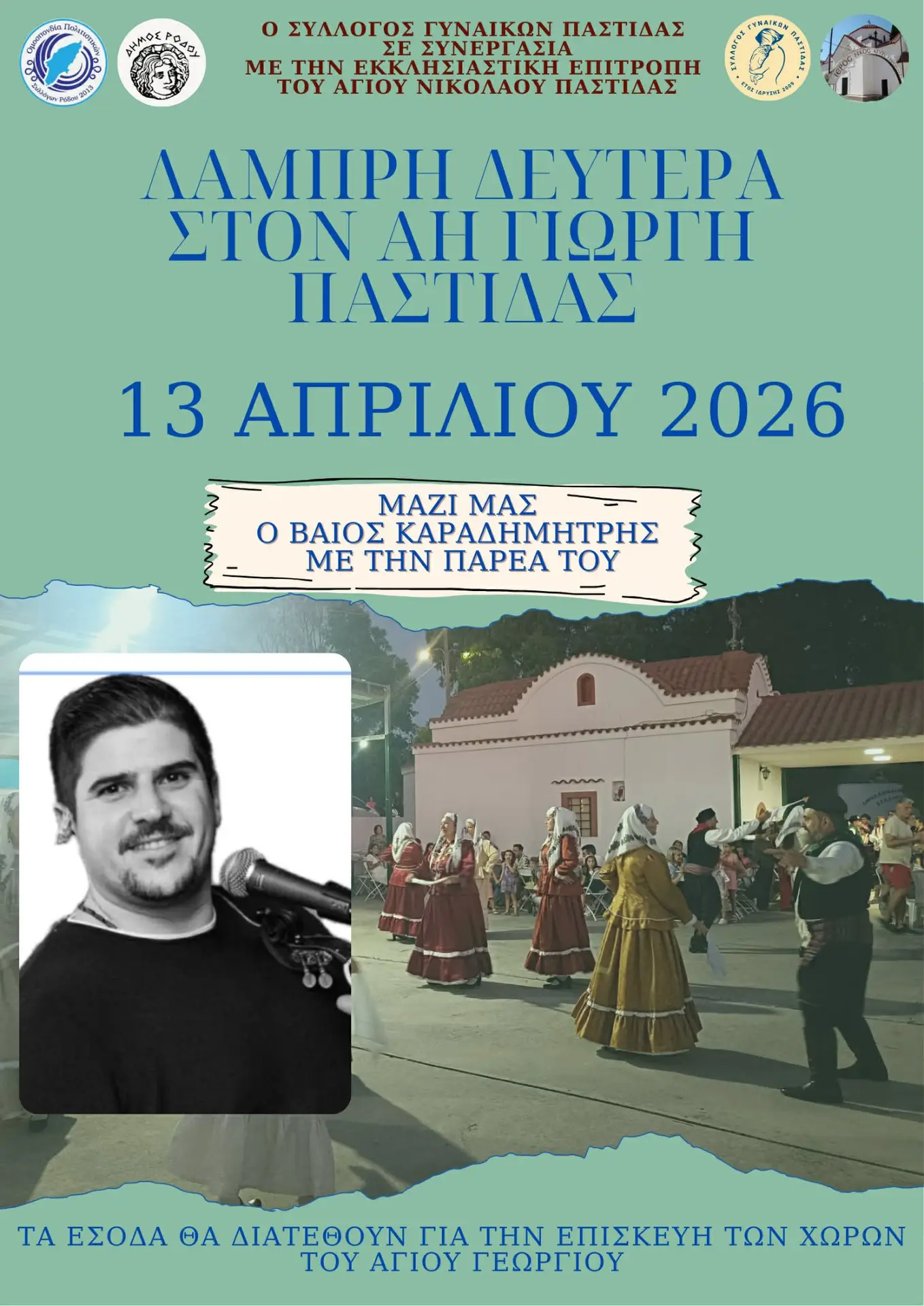 Ο Σύλλογος Γυναικών Παστίδας, σε συνεργασία με την Εκκλησιαστική Επιτροπή του Αγίου Νικολάου, μας προσκαλεί τη Λαμπρή Δευτέρα, 13 Απριλίου 2026, σε ένα αυθεντικό νησιώτικο γλέντι στον προαύλιο χώρο του Αγίου Γεωργίου.