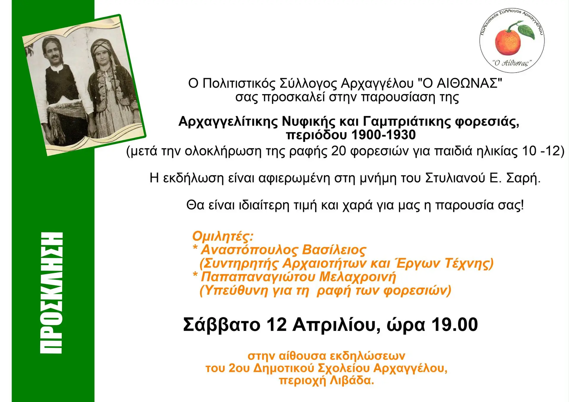 Ο Πολιτιστικός Σύλλογος Αρχαγγέλου «Ο Αίθωνας» σας προσκαλεί στην παρουσίαση της Αρχαγγέλιτικης Νυφικής και Γαμπριάτικης φορέσιας, περιόδου 1900-1930 (μετά την ολοκλήρωση της ραφής 20 φορέσιών για παιδιά ηλικίας 10-12).