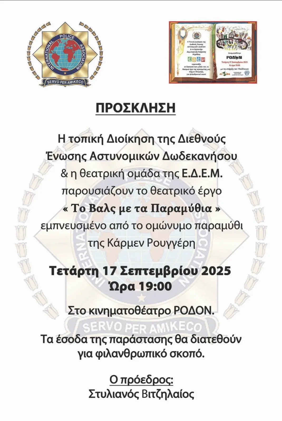Η Τοπική Διοίκηση της Διεθνούς Ένωσης Αστυνομικών Δωδεκανήσου και η θεατρική ομάδα της Ε.Δ.Ε.Μ. σας προσκαλούν στη θεατρική παράσταση «Το Βαλς με τα Παραμύθια», ένα έργο εμπνευσμένο από το ομώνυμο παραμύθι της Κάρμεν Ρουγγέρη.
