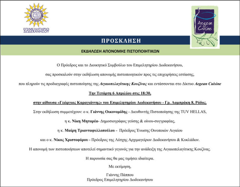Απονομή πιστοποιητικών στα μέλη του Δικτύου Aegean Cuisine