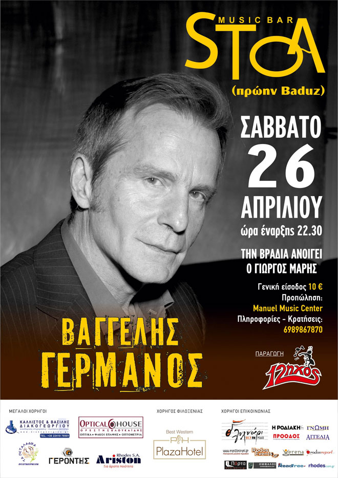 Ο Βαγγέλης Γερμανός το Σάββατο 26 Απριλίου για μια μοναδική εμφάνιση στη Ρόδο
